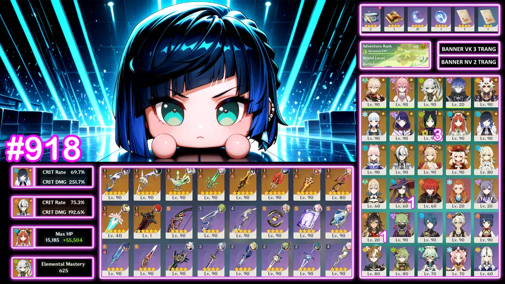 SIÊU PHẨM QUÁ NGON : EI C4R1 + ARLEC C1R1 + XILONEN C1 + VENTI R1 + HUTAO R1 + MAVUIKA R1 + FU R1 + AYAKA R1 SKIN + SHENHE SKIN + KAZUHA R1 + GANYU R1 + NHIỀU CHAR VIPP ( DIE GG )