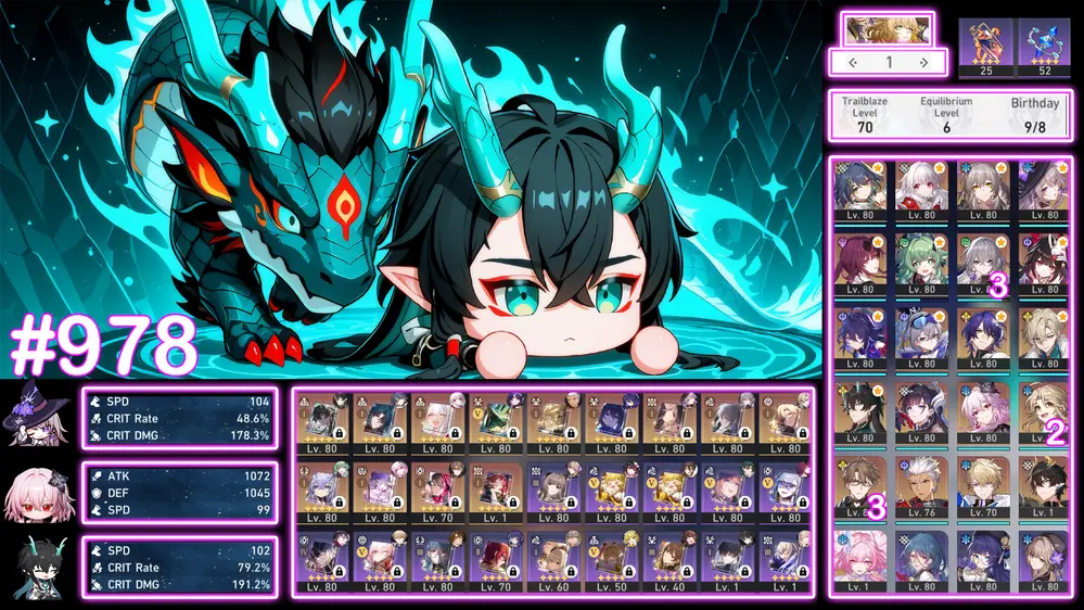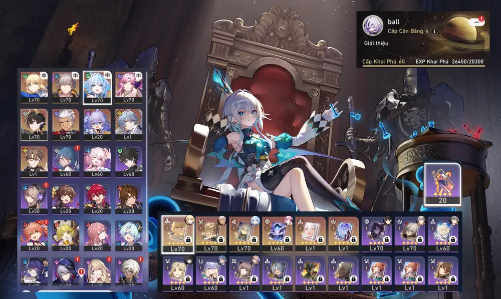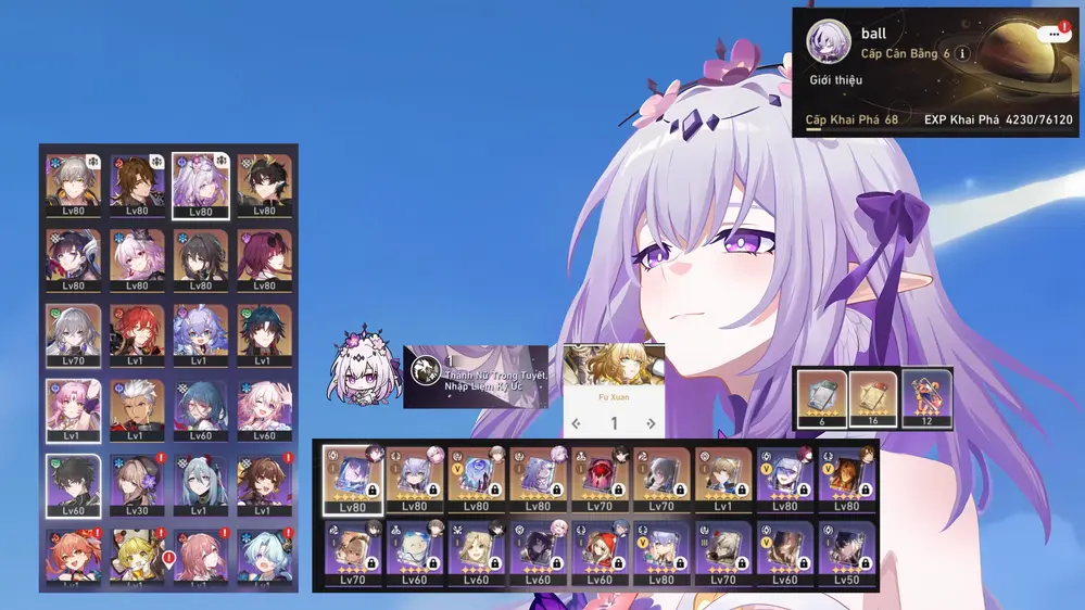 Tribble E1S1 , Robin E1S1 + Hyacine Trấn, Cyrene Trấn, Evernight Trấn, Castorice Trấn, Feixiao Trấn, The Herta Trấn. Acc Full Char Trấn Vip, Dư 82 Vé Vàng + 87 Nhiên Liệu. Build Vip Nhiều Char Trong Meta