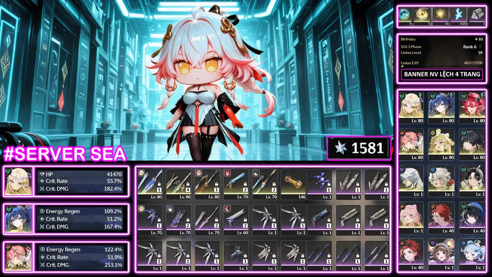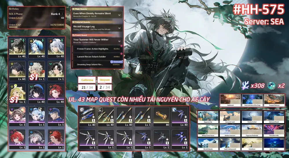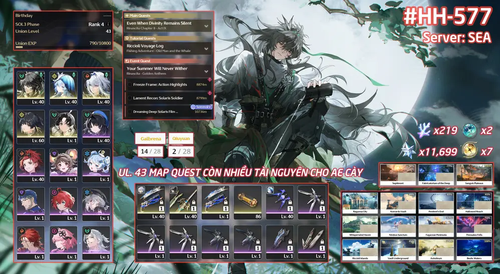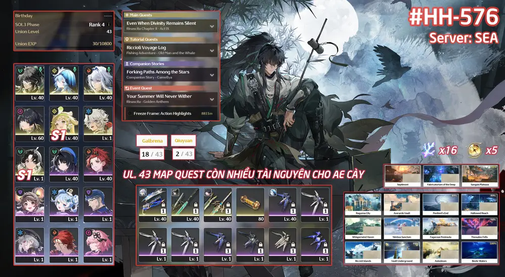 [#HH-576 SEA] Qiuyuan trấn + Shorekeeper + Galbrena trấn + Verina (S1) + 16 San hô + 5 roll vàng + Còn nhiều tài nguyên