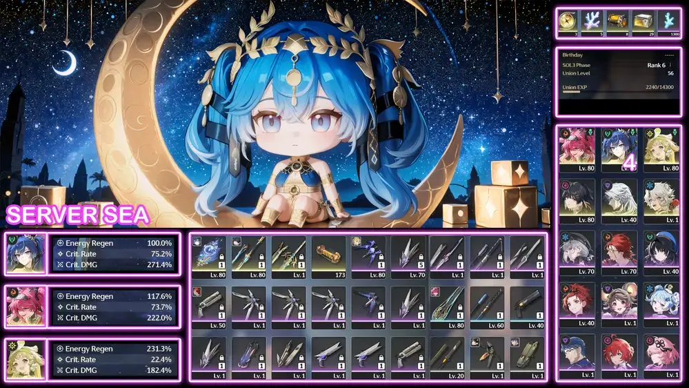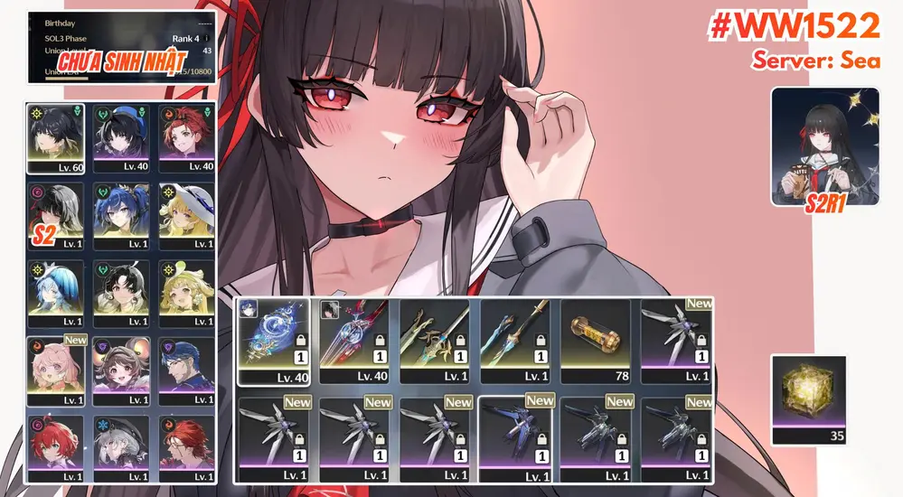 [ SIÊU PHẨM HẠT DẺ NHIỀU CHAR TRẤN CÒN TÀI NGUYÊN ] WW1521 Iuno R2A1 + Cartethyia R2A1 + Changli R1A1 + PhoeBe R0A1 + Canta R0A1 + Jinhsi R0A1 + Camellya + Shoe + Yao + Lynae ( Chưa Set Sinh nhật + còn nhiều tài nguyên )