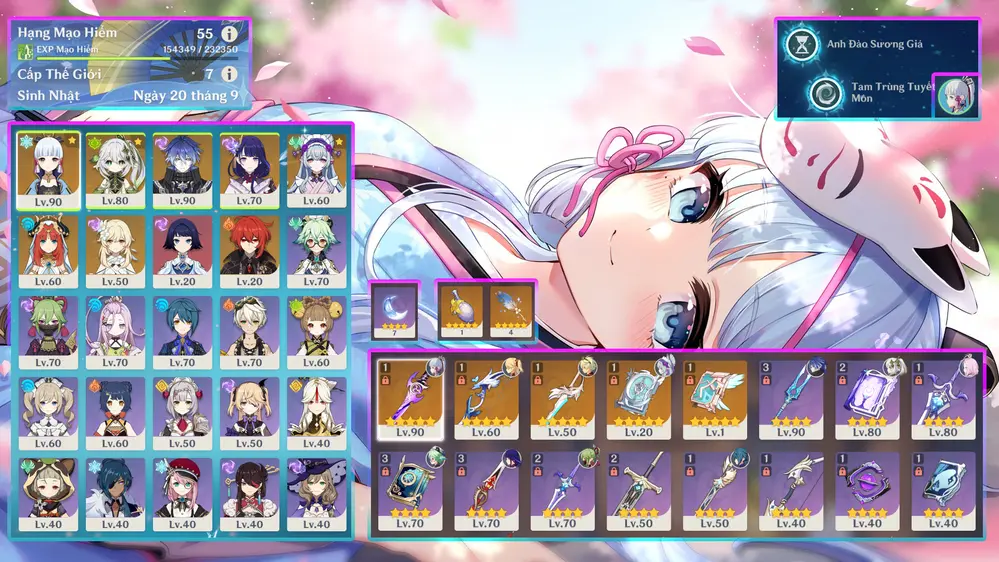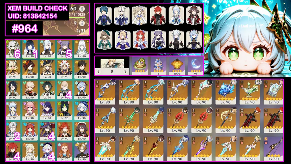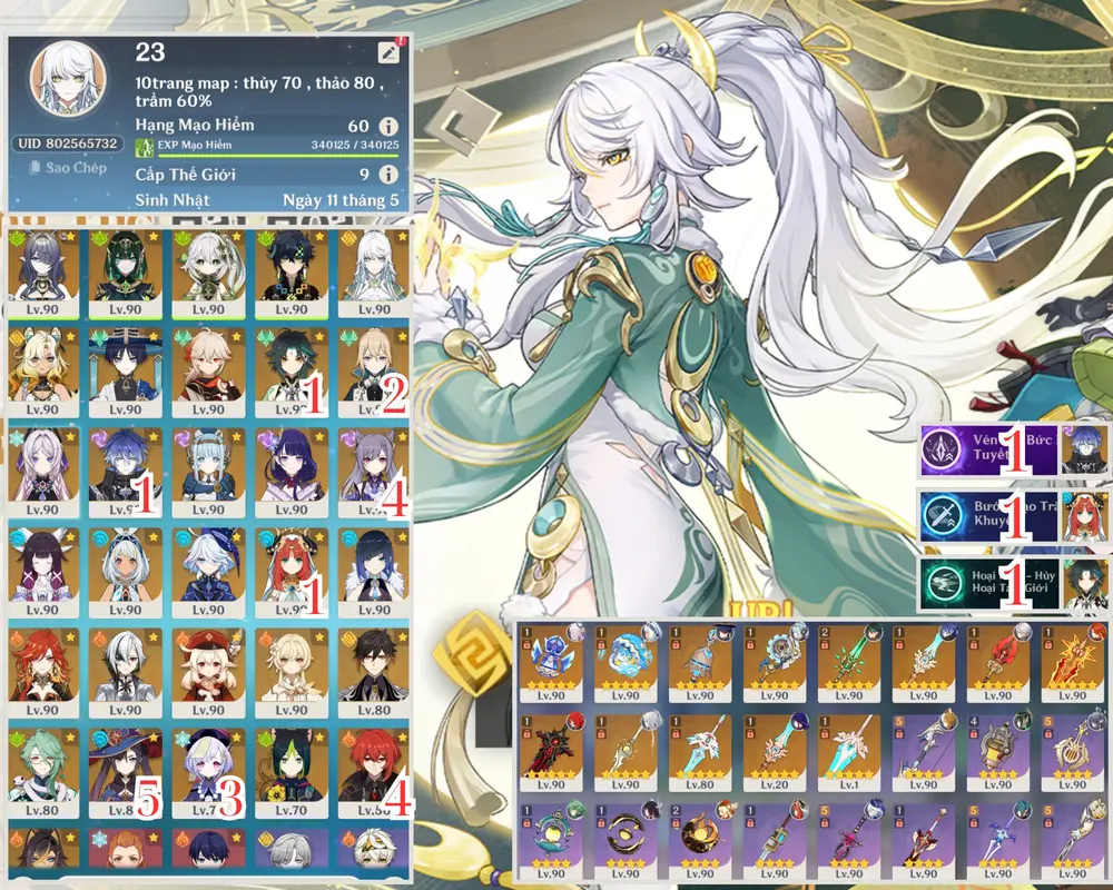 Nahida C6r1 + Yelan C1r1 + Keqing C5 + Neu C2r1 + Mona C4 + Diluc C4 + Qiqi C4 kèm theo rất nhiều char hot. Có các skin hot như Diluc, Ayaka, Hutao, Nilou, Keqing, Shenhe, Ganyu. Banner nhân vật 8 trang dư 97 nhựa dễ vỡ (964)