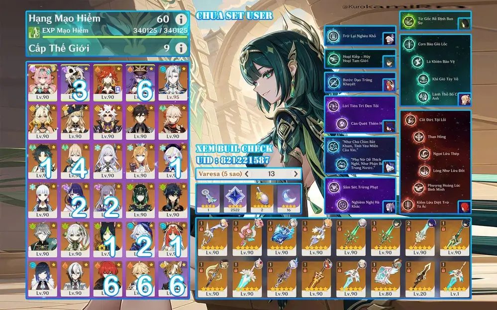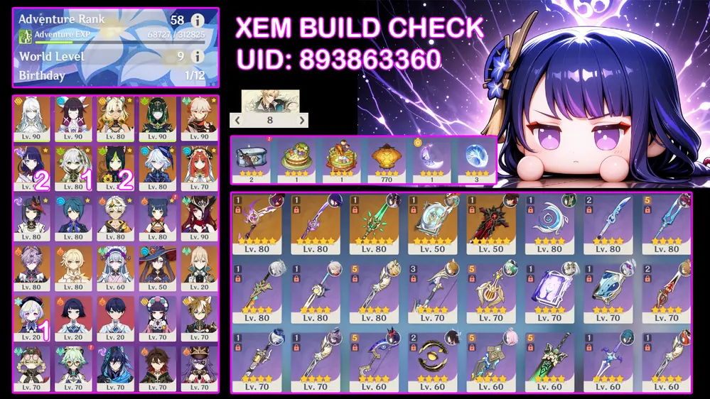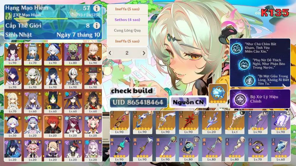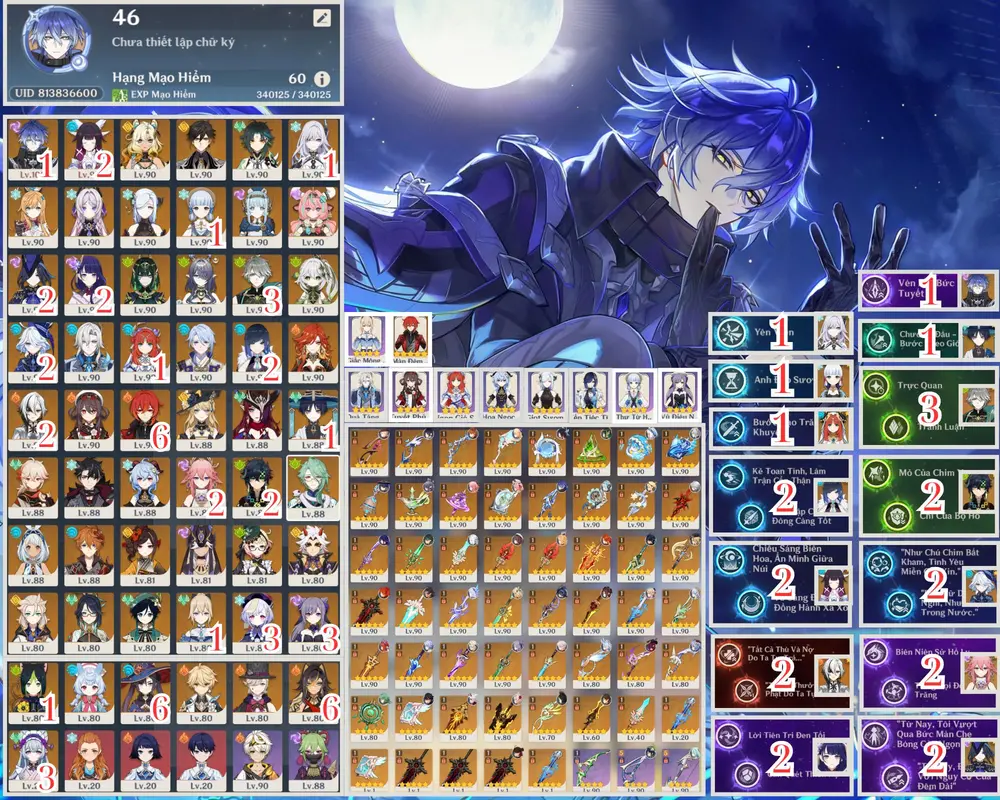 Skin Neu C1r1 + Kazuha trấn + Furina trấn + Zhongli trấn + Xiao C1r1 + Ei C2 lao xiên cá r5 + Baizhu + Nahida trấn + Yelan trấn + Arlec + Hutao trấn + Xilonen + Jean C1 + Zibai + Qiqi C2 + Keqing C1 + Diluc C1 + Mona C1 + Tig. Dư 23 nhựa dễ vỡ (965)