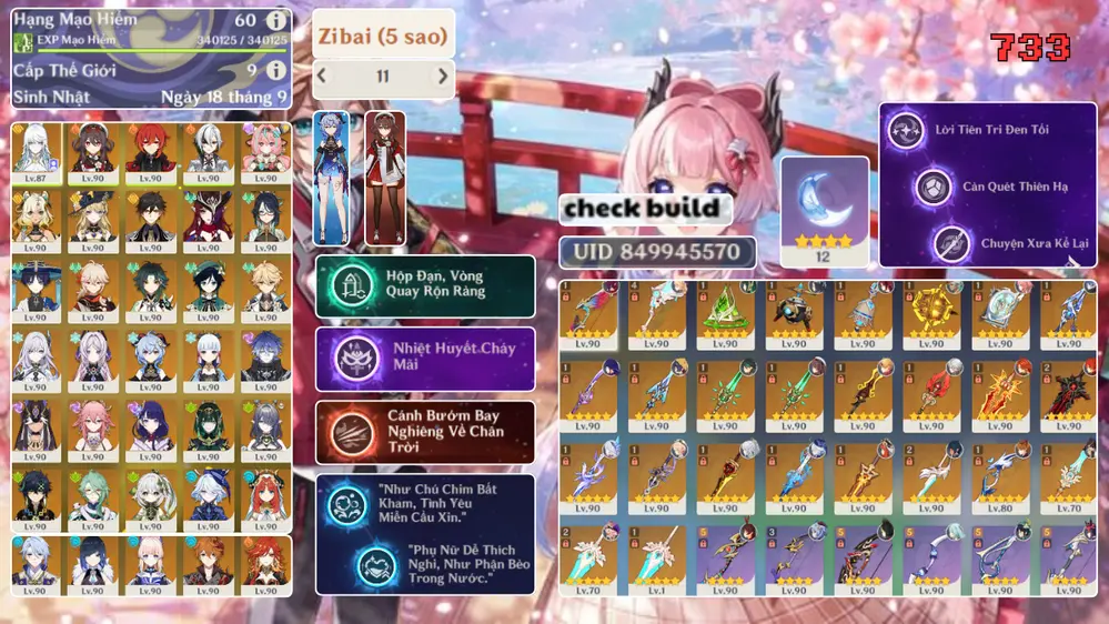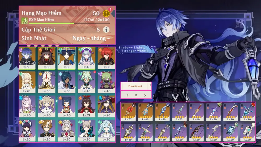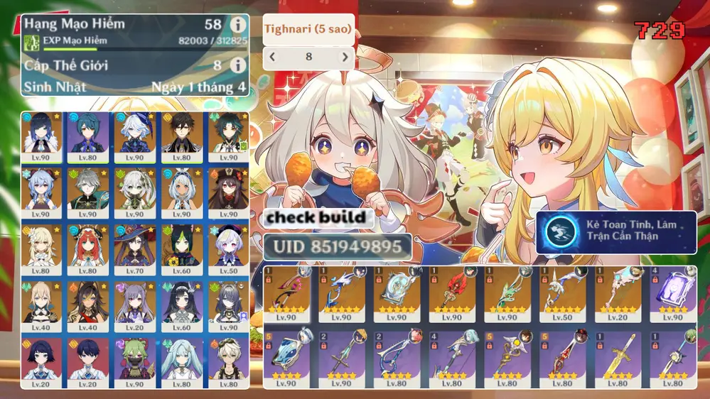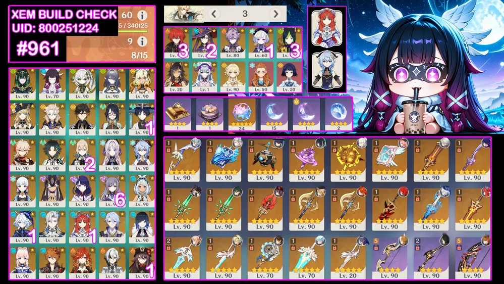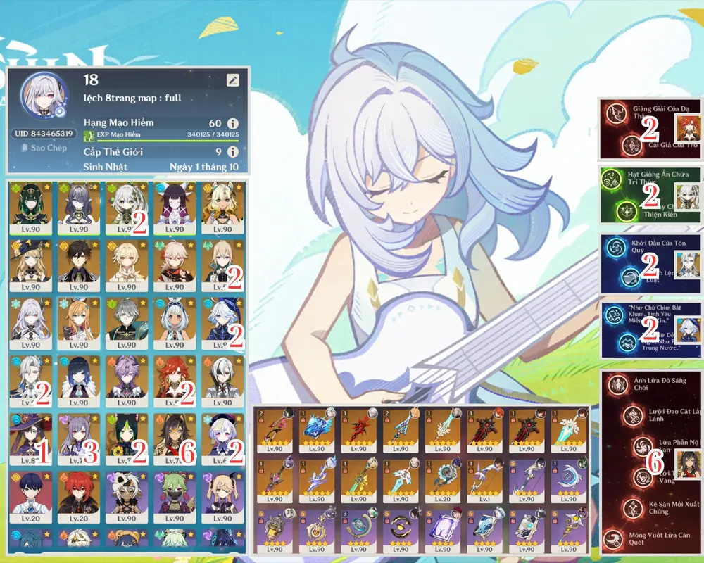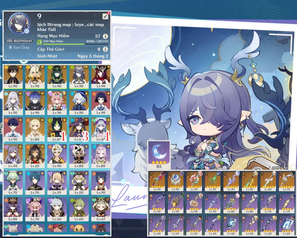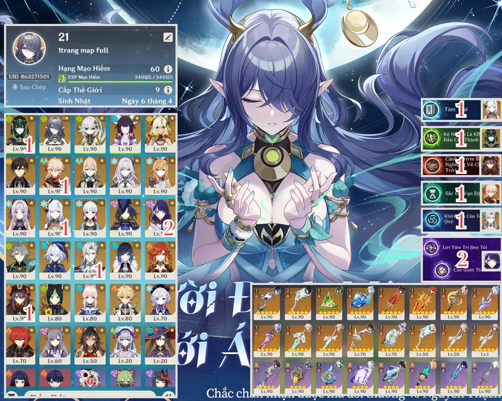 Acc siêu ngon ae ơi rất nhiều char và team đẹp cho ae trải nghiệm có luôn keqing c6, đã có durin cho ae nào thích lấy varka dư sẵn 34 roll limited. Kèm theo 2 skin đẹp của nilou và ganyu ( 961 )