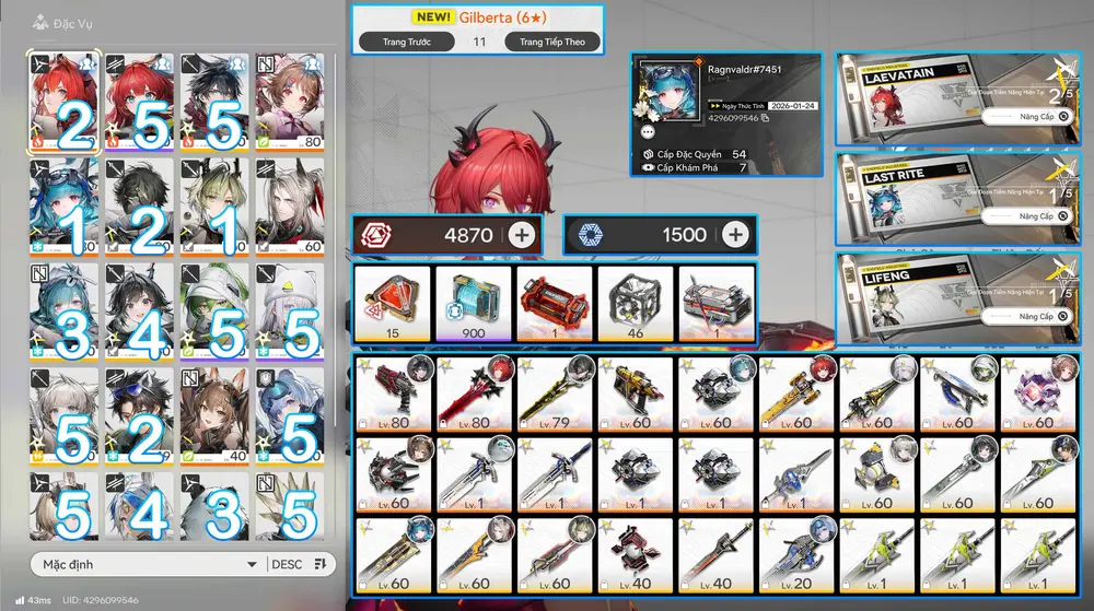 LAEVATAIN TRẤN - GILBERTA P1 TRẤN - LAST RITE TRẤN + NHIỀU VK + CHAR 6 SAO VIP